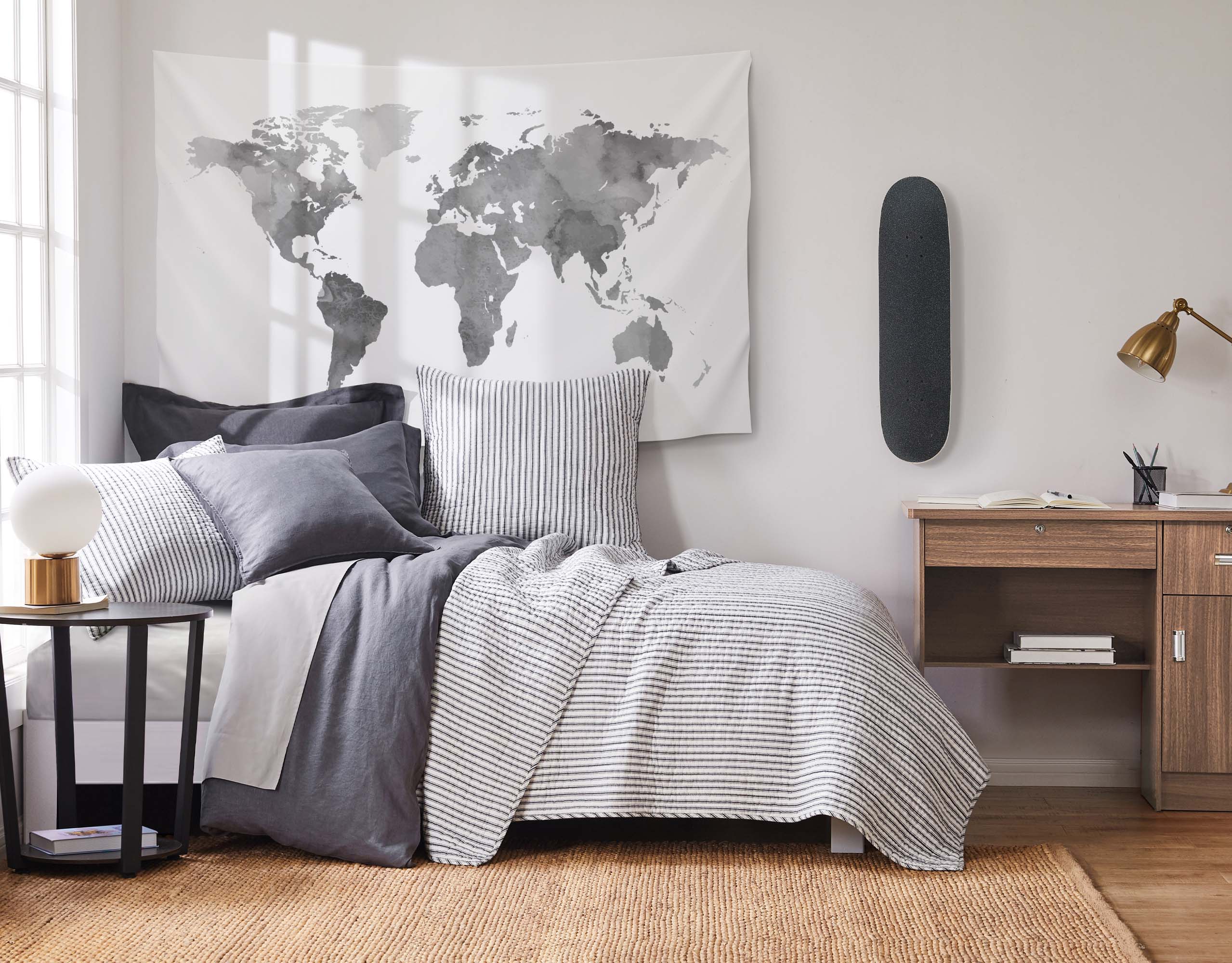 BEDDING SHOWN: TOBAGO STRIPE QUILT OVER CHARCOAL LINEN DUVET COVER
