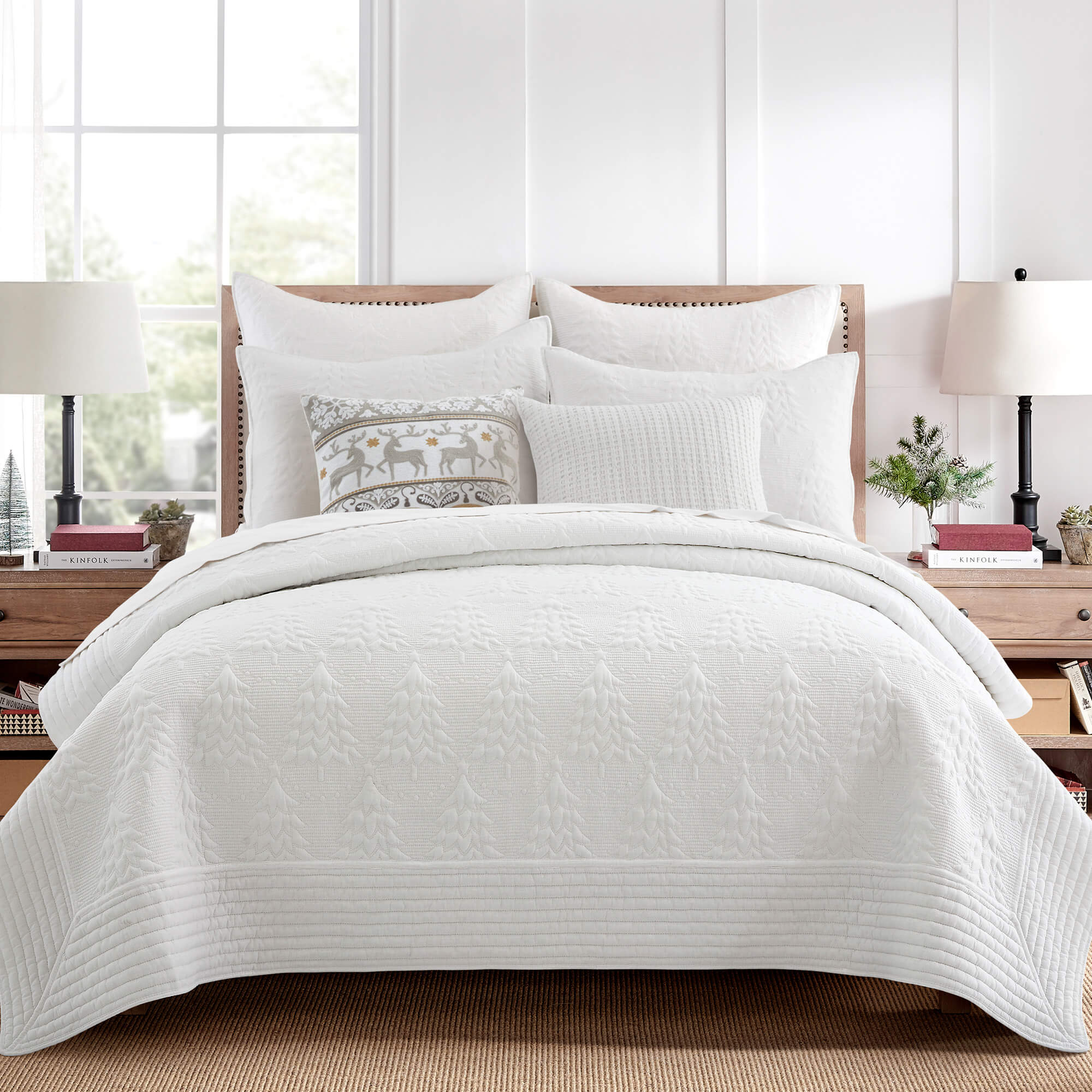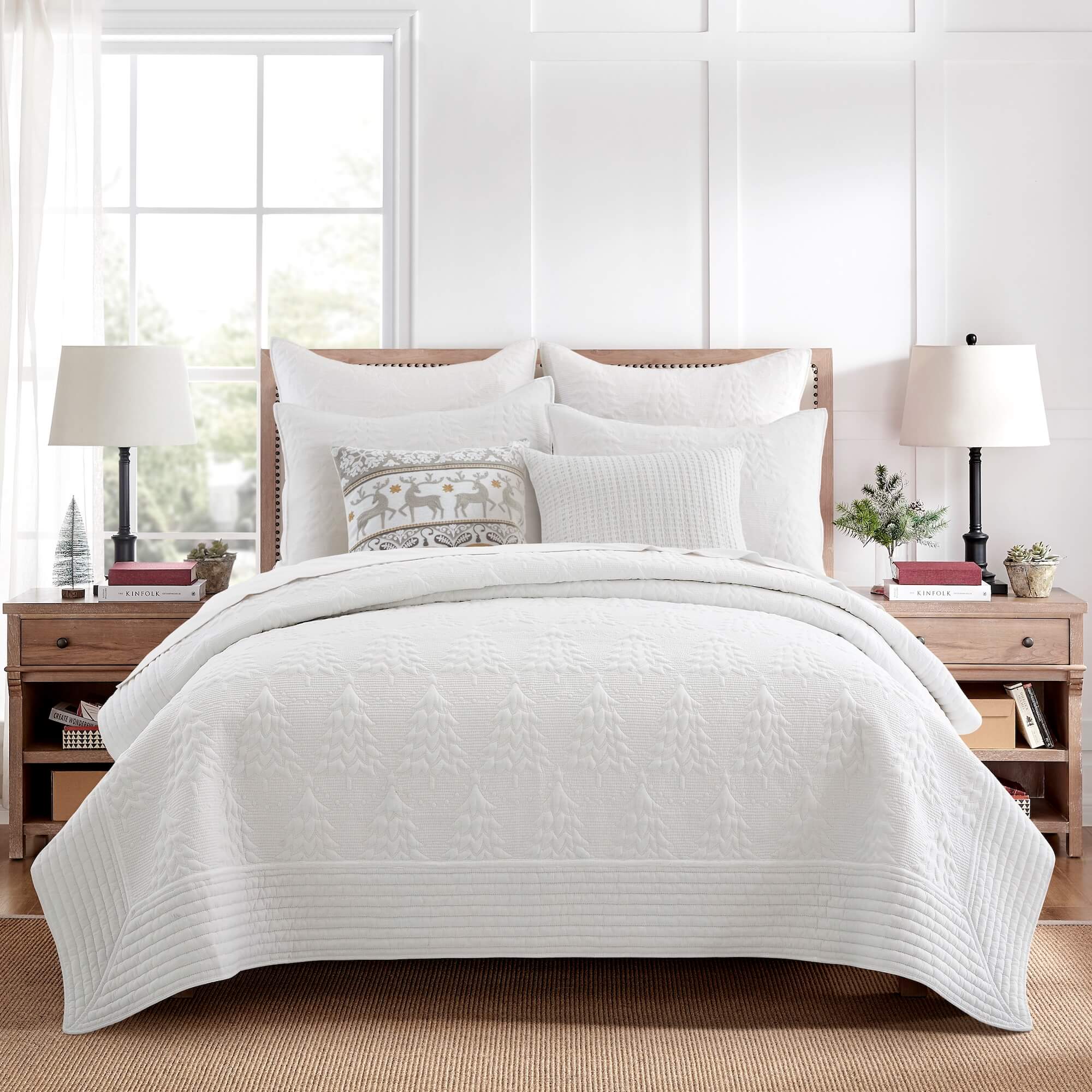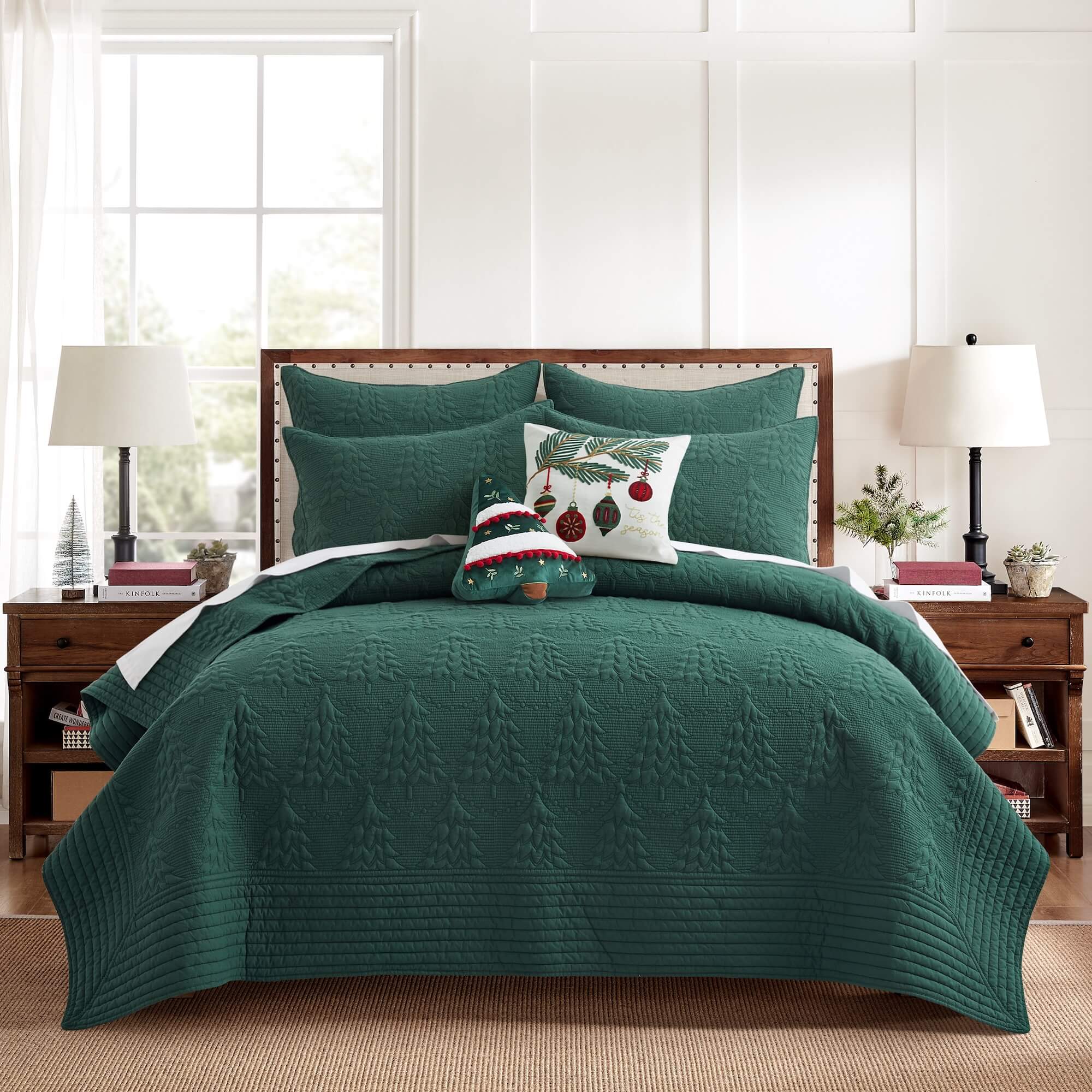 "Tatum Pines bedspread set is festive for Christmas but not too festive where you can use it all winter long. The flip size has a plaid look and is reversible. It's 100% cotton and so soft. The pillow shams are so cozy and roomy and the back side has little ties and so cute. I'm obsessed with this new bed look."