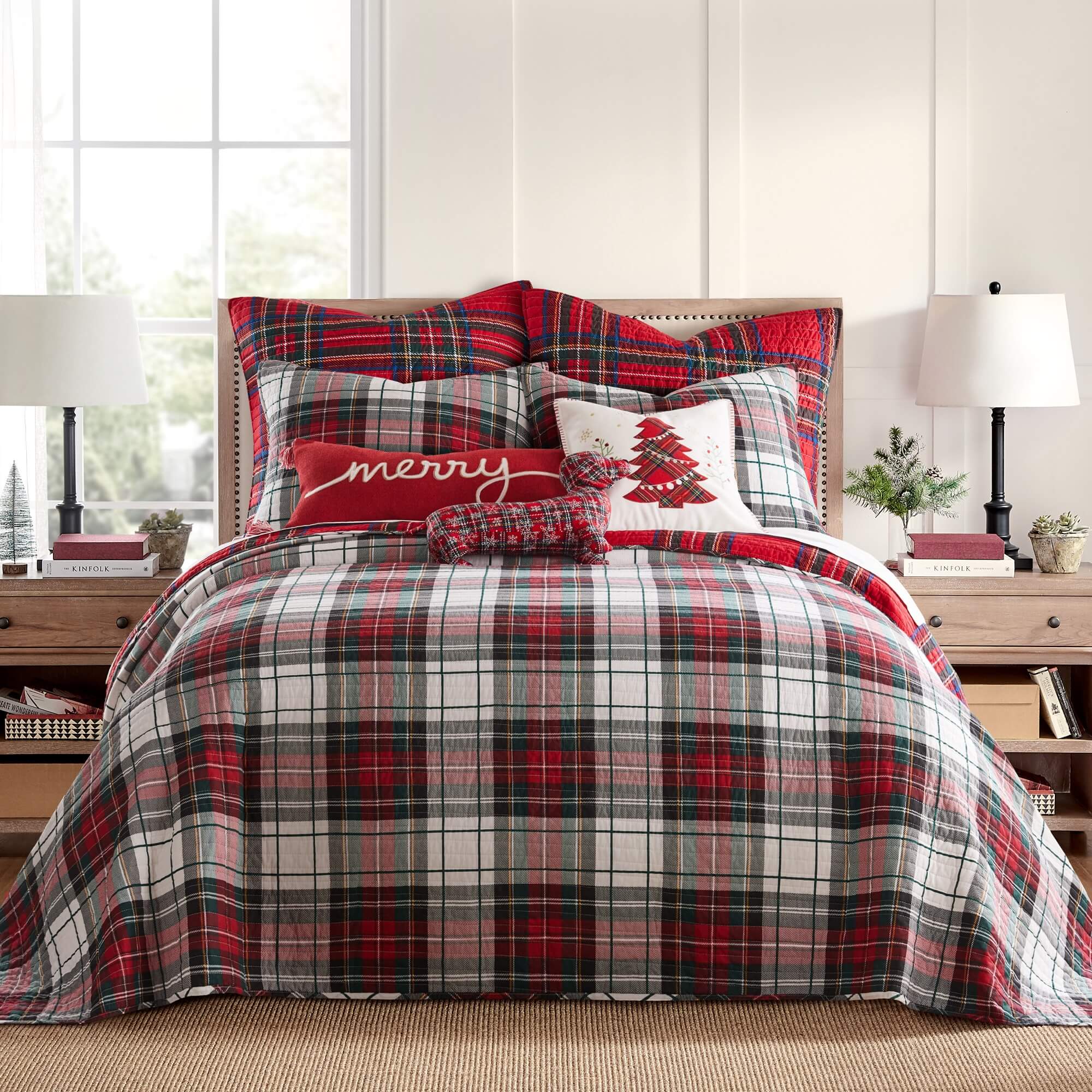 "Tatum Pines bedspread set is festive for Christmas but not too festive where you can use it all winter long. The flip size has a plaid look and is reversible. It's 100% cotton and so soft. The pillow shams are so cozy and roomy and the back side has little ties and so cute. I'm obsessed with this new bed look."