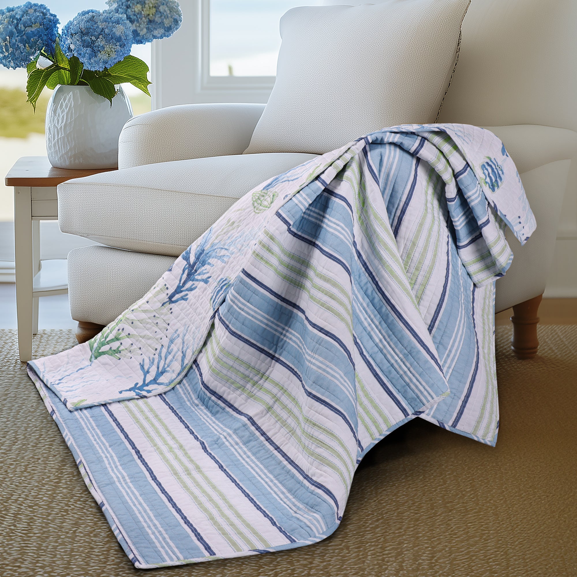 When coastal summer breezes come knocking, it can be a challenge to decide what is best to use for bedding: a quilt or a comforter. For some beachy bliss all year round, why not go for both? Start with creating a bed of coastal dreams by adding cotton or linen sheets linen. Then layer up with a lightweight quilt, a perfect weight for Summer nights. Then top off the look with a comfy and colorful coastal comforter that you can pull up if the nights get cool or to use in the cooler months.