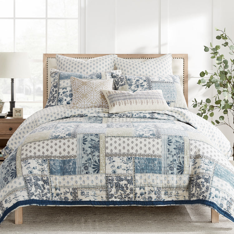 The Aliza Reversible Quilt Set by Levtex Home is inspired by artistic folk art. Offered in blue, navy, taupe and cream, this design will immediately transform your bedroom. This reversible quilt features an array of florals, medallions and paisleys in various tones of blue and cream on the front, reversing to a mini blue medallion on a cream gorund. on the back. The Quilt set has a cotton front and back, filled with a cotton-rich filler, and are machine washable. Enjoy this for years to come!