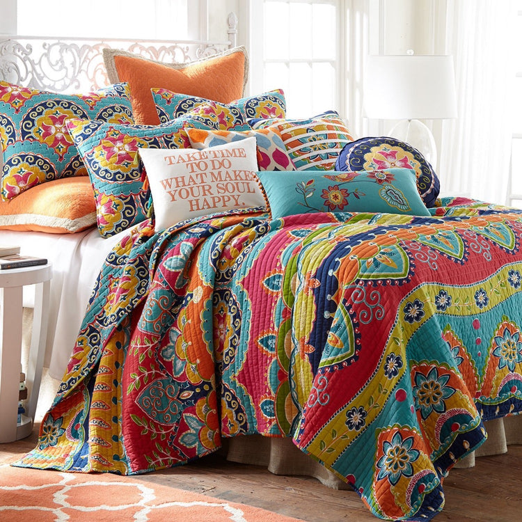 The Amelie Reversible Quilt Set by Levtex Home is inspired by antique colorful fabrics. This intricate, bright medallion design will immediately transform your bedroom. Made with the softest lightweight cotton and filled with a cotton-rich filler (that includes cotton, polyester and other fibers), this reversible quilt features a bright, colorful medallion, reversing to a bright medallion on the other. The Quilt Set is machine washable. Enjoy this for years to come!