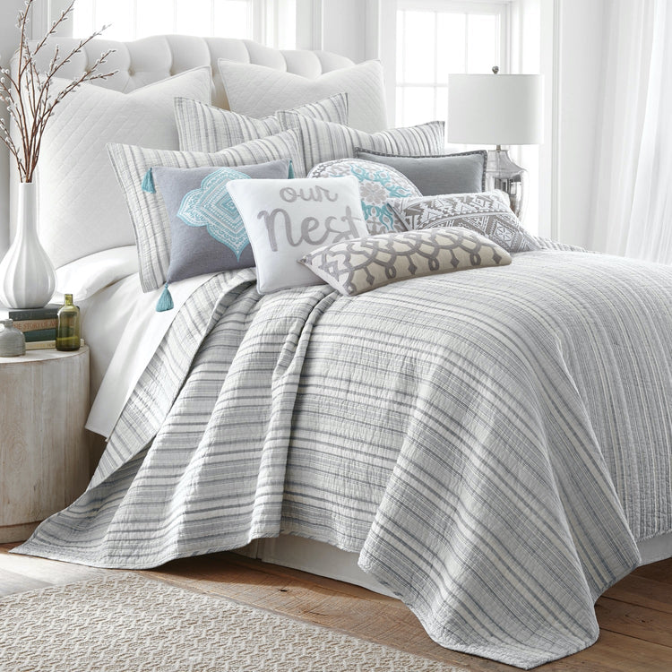 The Bondi Quilt Set by Levtex Home is inspired by the subtle sophistication of a luxurious European hotel. This simple stripes design will immediately transform your bedroom. Made with the softest lightweight cotton, this quilt features a grey and white textured stripe on both sides, reversing to a grey and white stripes on the other. The Quilt Set is filled with a cotton-rich filler (that includes cotton, polyester and other fibers) and is machine washable. Enjoy this for years to come!