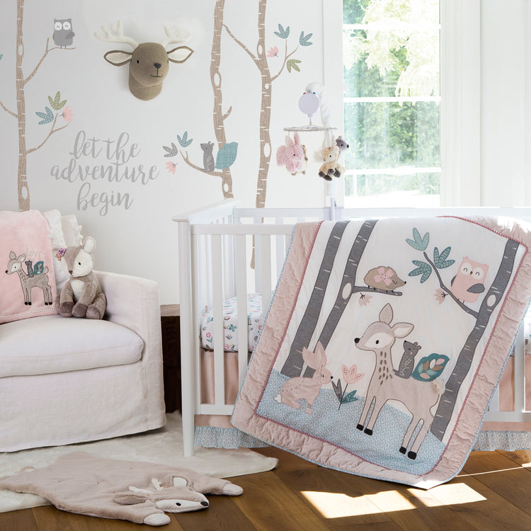You will think that you are in a beautiful woodland glade with the adorable woodland animals In our Everly collection. The fitted sheet is toss of woodland animals in pinks and teals on a white ground set off by a dust ruffle made of soft pink fabric with a contrast ruffled blue ikat print edge. The quilt features a deer in a glade with her woodland friends (squirrel, owl, rabbit and hedgehog), all appliqued and detailed in embroidery, surrounded by a pom pom trim and lush velvet border. Our diaper stacker has a waterfall of ruffles in teal ikat and a pink header featuring the word Love, embroidered among flowers, while the large nursery wall decal depicts a grove of trees with a squirrel and owls and the words, Let the Adventure Begin. This is the perfect set to complete your little nursery. Coordinating items available.