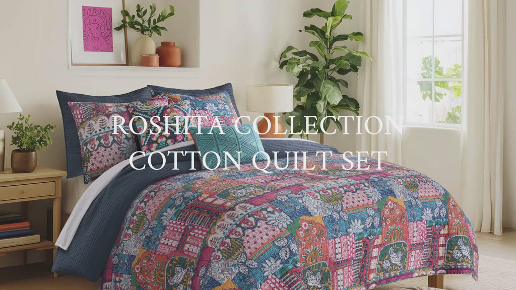 The Roshita Quilt Set brings vibrant boho style and global charm to your bedroom with its richly detailed patchwork design inspired by traditional motifs from around the world. Quilted for added texture and comfort, it is crafted with cotton front and back and filled with a cotton-rich fill that includes cotton, polyester, and other fibers, creating a lightweight yet cozy layer that adds color, character, and relaxed artistry to your space.
