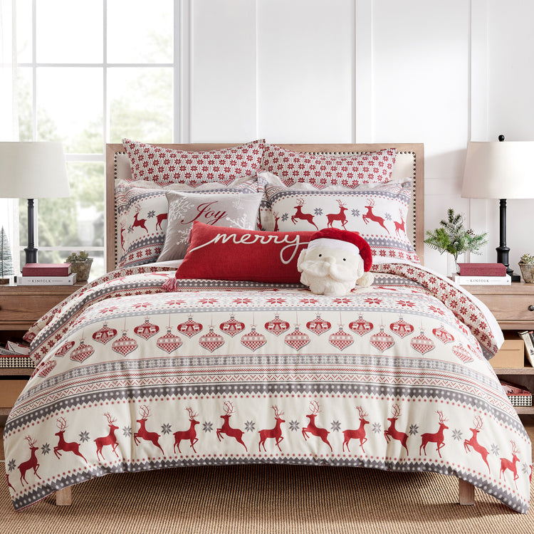 The Silent Night Duvet Cover Set by Levtex Home is inspired by a cozy Christmas. Offered in red, grey and cream, this design will immediately transform your bedroom. Made with a soft and luxurious cotton, this duvet cover set features a collection of deer, ornaments and snowflakes. It has a print of Christmas icons on the front and a snowflake medallion on the reverse. The duvet cover closes with easy to use, durable buttons. Insert not included. The Silent Night Duvet Cover Set is machine washable. Enjoy this for years to come!