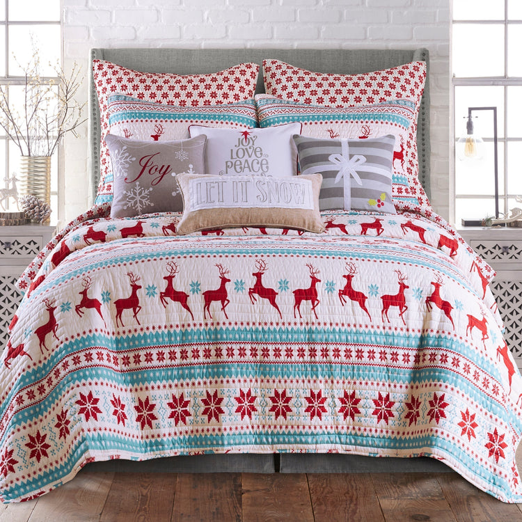 The Silent Night Reversible Quilt Set by Levtex Home is inspired by cozy fair isle sweater knits. Offered in teal, red and white, this design will immediately transform your bedroom. Made with the softest pre-washed cotton, this reversible quilt features a print of deer, ornaments and snowflakes in rows, reversing to snowflake medallion on the other. The Quilt Set is filled with a cotton-rich filler (that includes cotton, polyester and other fibers) and is machine washable. Bring the holidays home!
